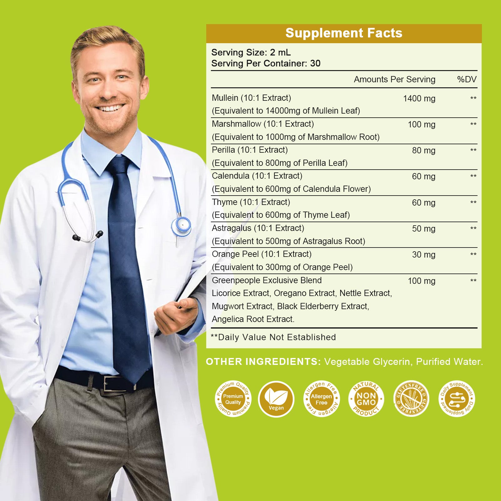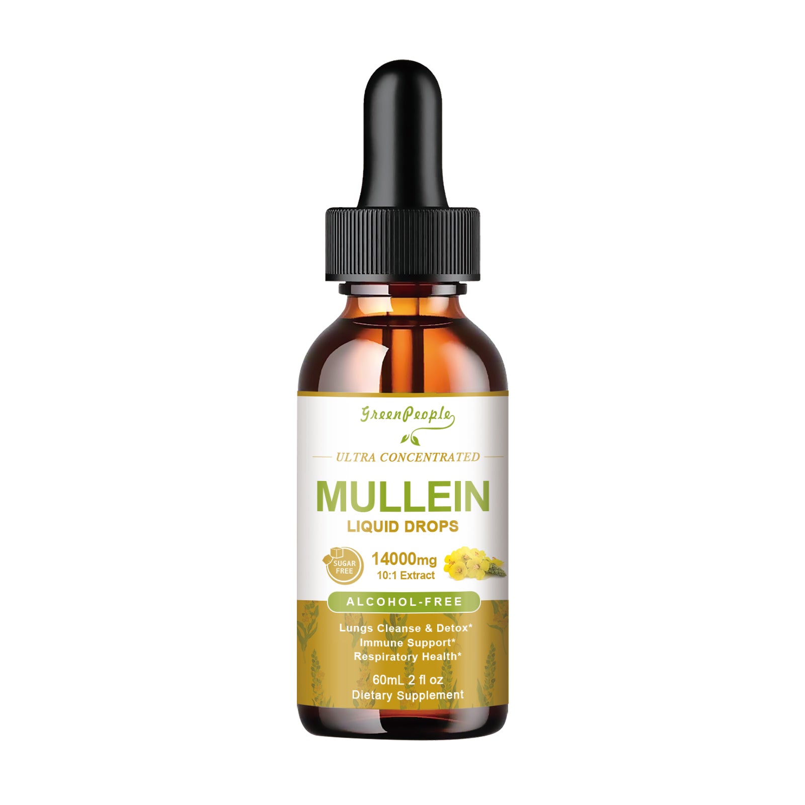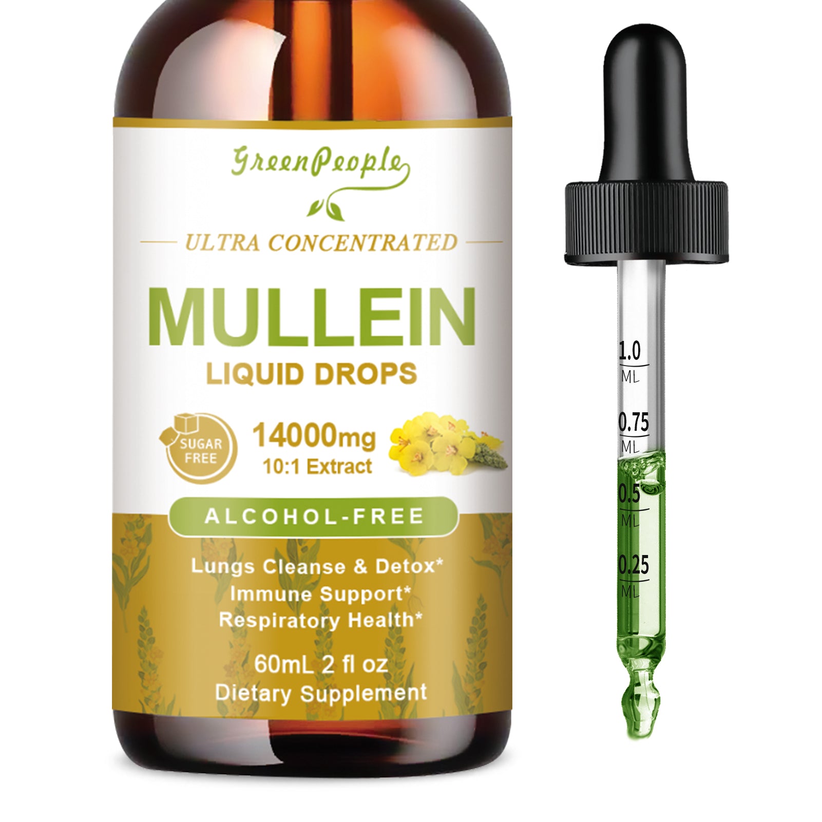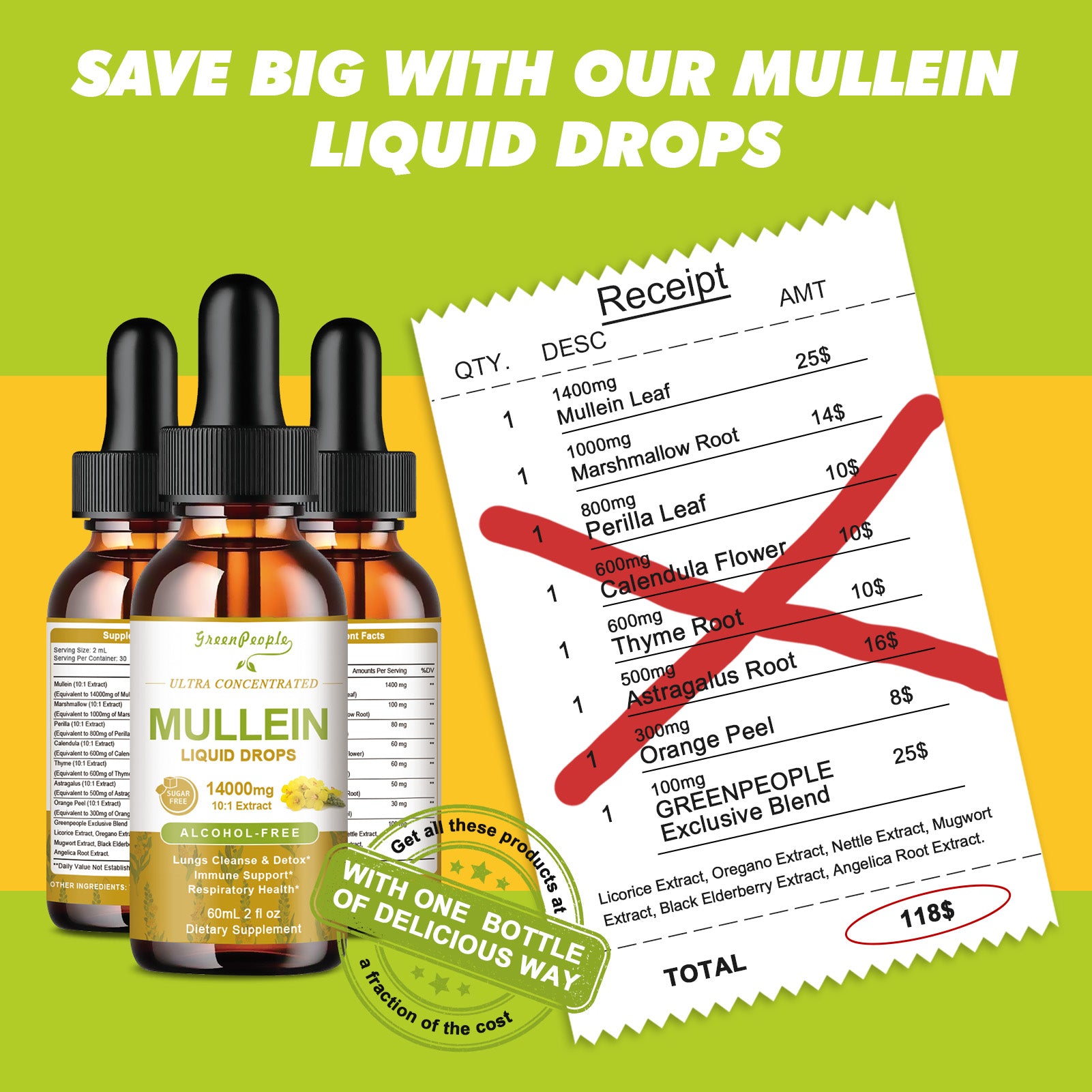 Experience the unparalleled potency of our concentrated Mullein Drops, boasting an impressive 14,000mg strength per serving. This 10:1 extract concentration ensures you receive the full spectrum of Mullein's respiratory benefits, offering robust support for lung health. Honoring the age-old tradition of Mullein's respiratory nurturing properties, our drops provide comprehensive relief and vitality for the respiratory system, ideal for those seeking seasonal comfort or long-term wellness. Formulated with a synergistic blend of Mullein, Black Elderberry, Calendula Flower, and our exclusive Greenpeople Blend, each ingredient is meticulously selected for its unique contribution to respiratory support. This harmonious fusion targets various aspects of lung function, promoting free breathing and vitality. Additionally, our Mullein Drops offer extra strength with immune-boosting extracts like Astragalus Root and Black Elderberry, coupled with digestion-friendly ingredients like Calendula & Licorice, providing comprehensive support for overall well-being. Elevate your health journey with every drop.
