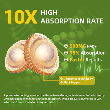 - Liposome Technology For Maximum Absorption: Liposome technology ensures that help NAD,Resveratrol, Quercetin enter the cells directly, and Black pepper enhances nutrient absorption, with a bioavailability of up to 98%, which is 10 times that of ordinary capsules.