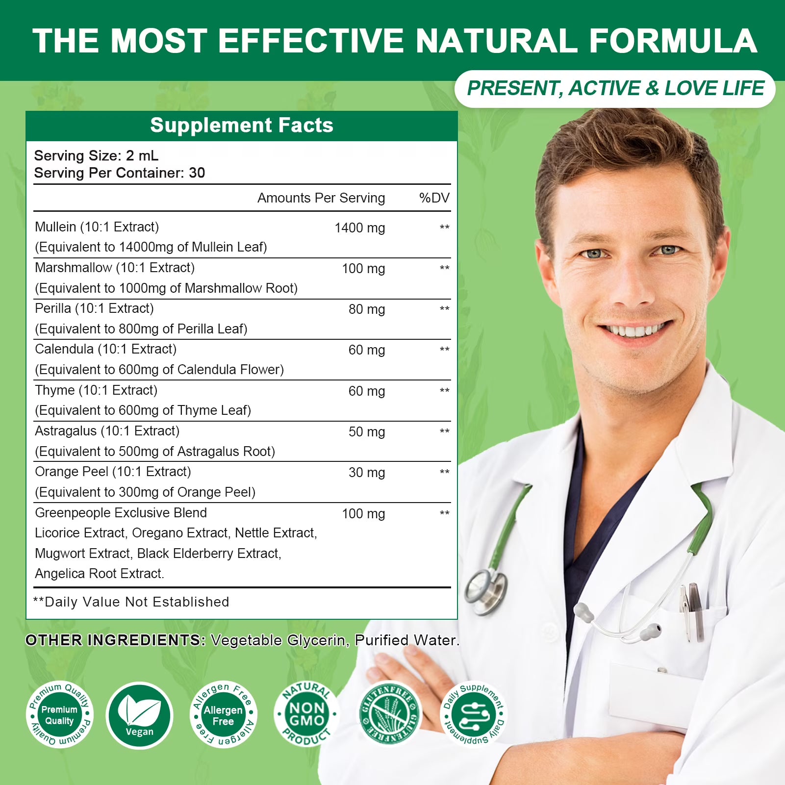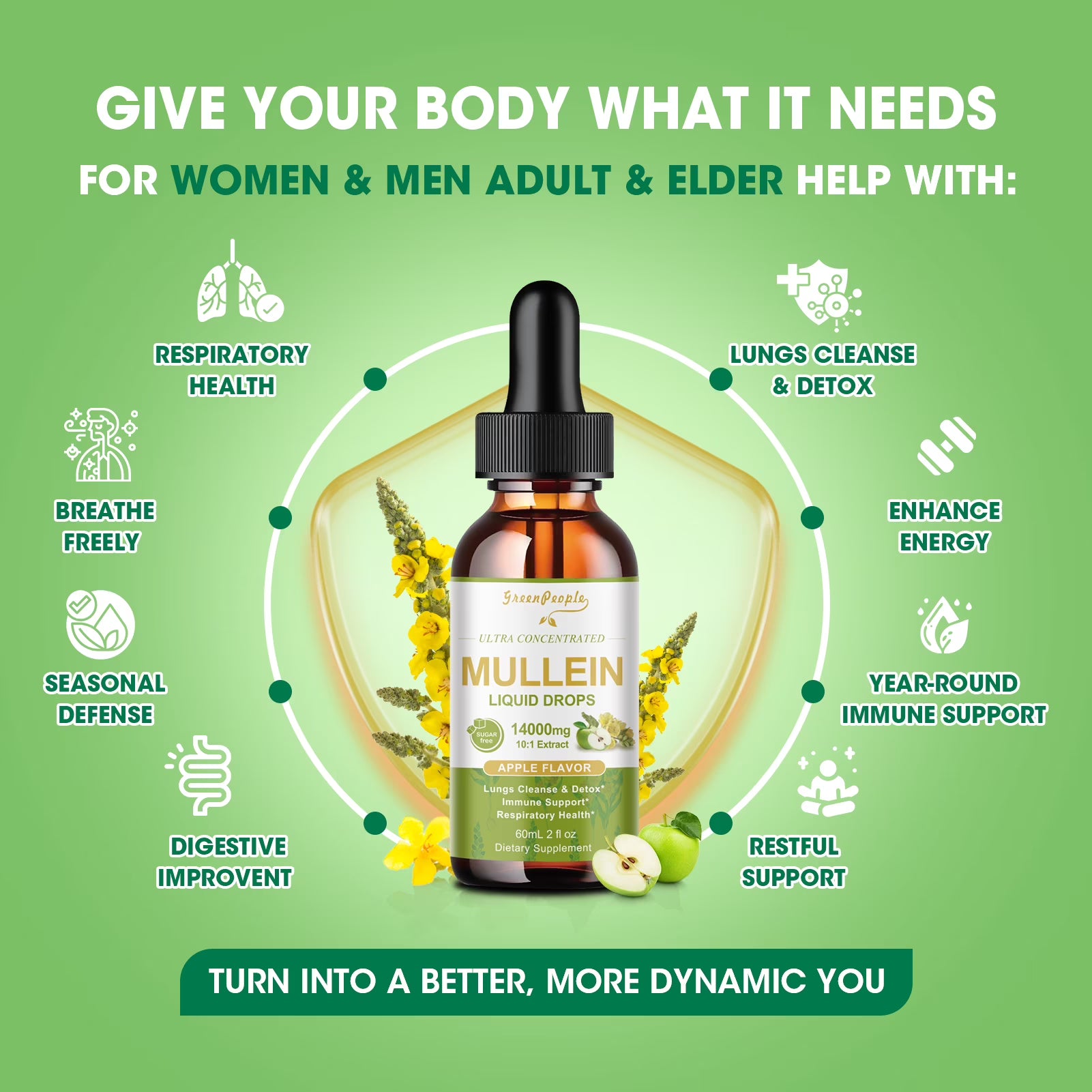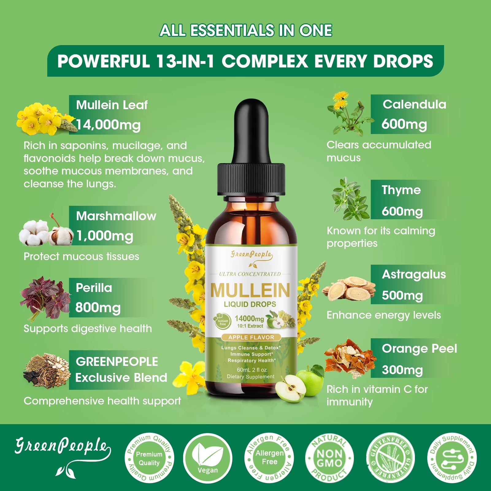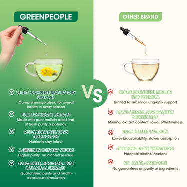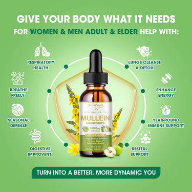 GreenPeople’s Ultra Concentrated Mullein Liquid Drops offer a powerful 13-in-1 herbal blend designed to support respiratory health, detoxify lungs, and boost immunity naturally. Featuring 1400mg of mullein leaf extract per serving—crafted with alcohol-free technology for maximum purity—this formula combines nature’s finest herbs like marshmallow, calendula, thyme, and astragalus. Rapidly absorbed (98% bioavailability) and vegan-friendly, it promotes year-round vitality, digestive wellness, and energy enhancement. Enjoy the refreshing apple flavor in a sugar-free, non-GMO, and allergen-free formula. Perfect for adults and seniors seeking a holistic approach to wellness
