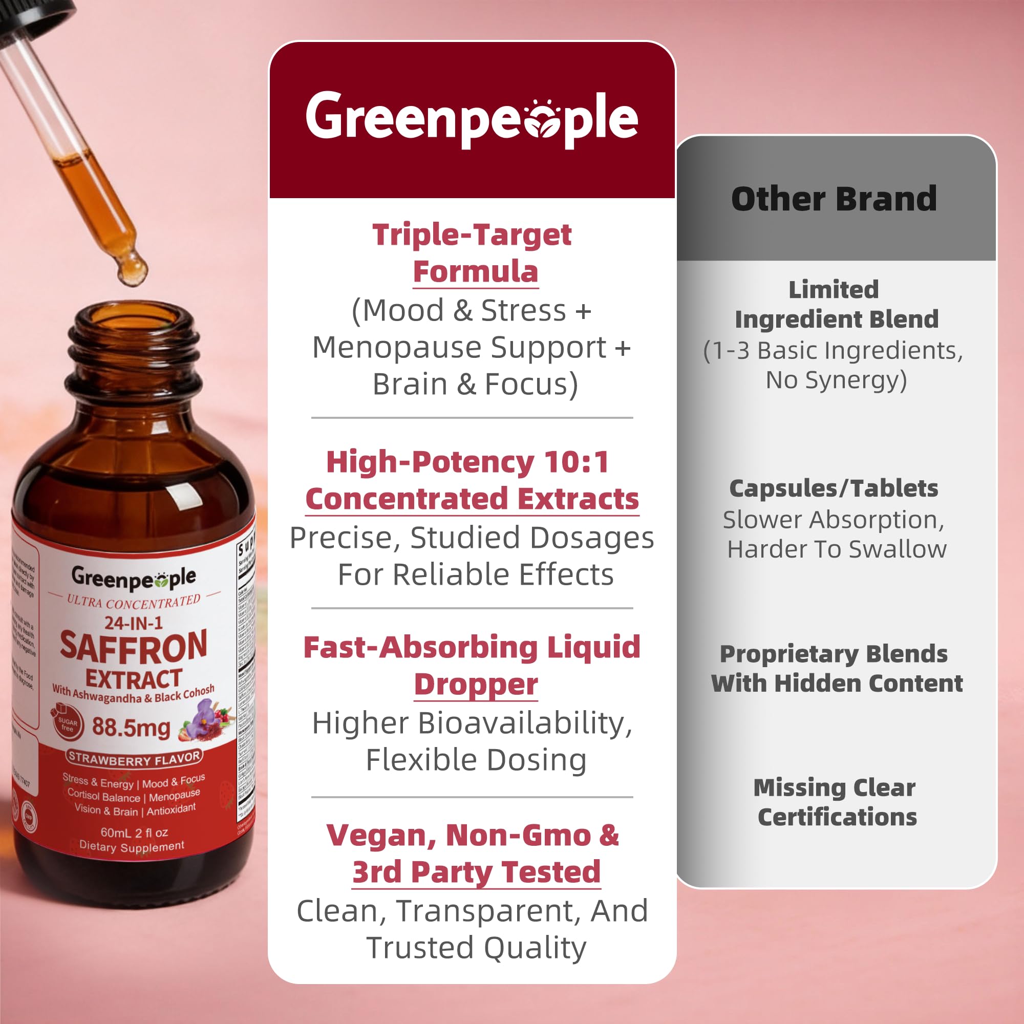 Unlock a balanced lifestyle with the GREENPEOPLE 24-in-1 Saffron Extract Formula. A masterfully blended liquid supplement designed for holistic emotional, cognitive, and hormonal resilience.
