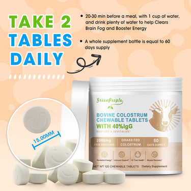 - ☑️QUALITY YOU CAN TRUST - We stand by ethical and quality sourcing. Each jar colostrum chewable symbolizes our unwavering commitment to providing you with the absolute best. With every 2 tablets, you're embracing wellness with integrity. Elevate your well-being with GREENPEOPLE Bovine Colostrum 2000mg Colostrum - because your wellness deserves nothing but the finest.