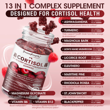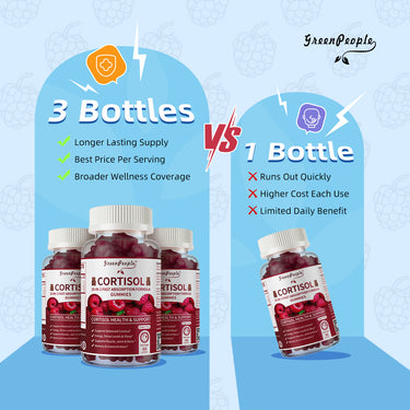 GreenPeople Cortisol Balance Gummies are thoughtfully crafted with a powerful blend of ingredients including Ashwagandha, Turmeric, L-Theanine, Phosphatidylserine, Magnolia Bark, Lion’s Mane (Hericium Erinaceus), Licorice Root, Eleutherococcus, Maritime Pine, St. John's Wort, Black Pepper, and more. These ingredients work together to support healthy cortisol levels, stress resilience, and overall wellness—making them an ideal daily cortisol detox for women.